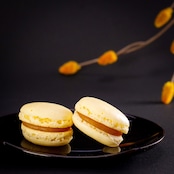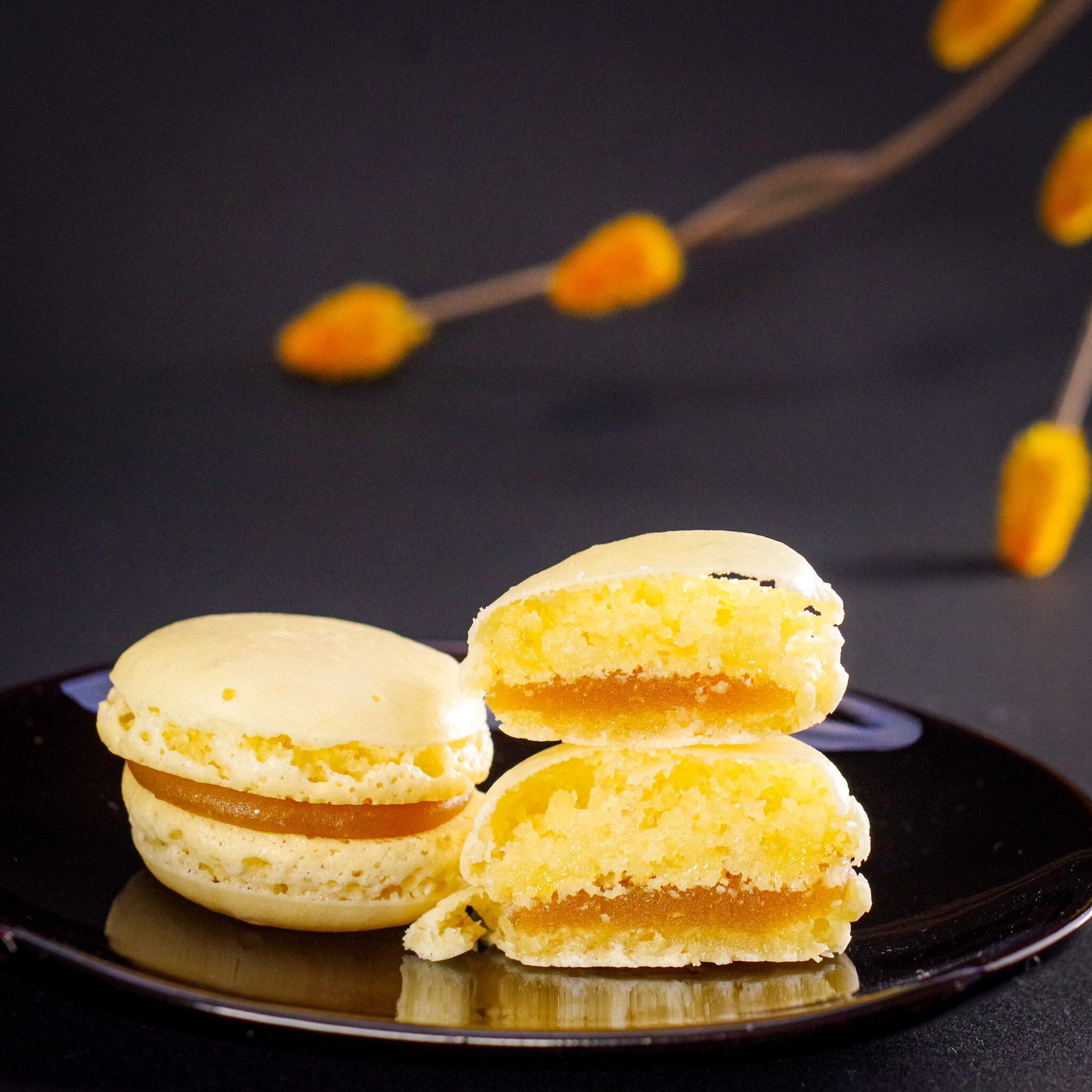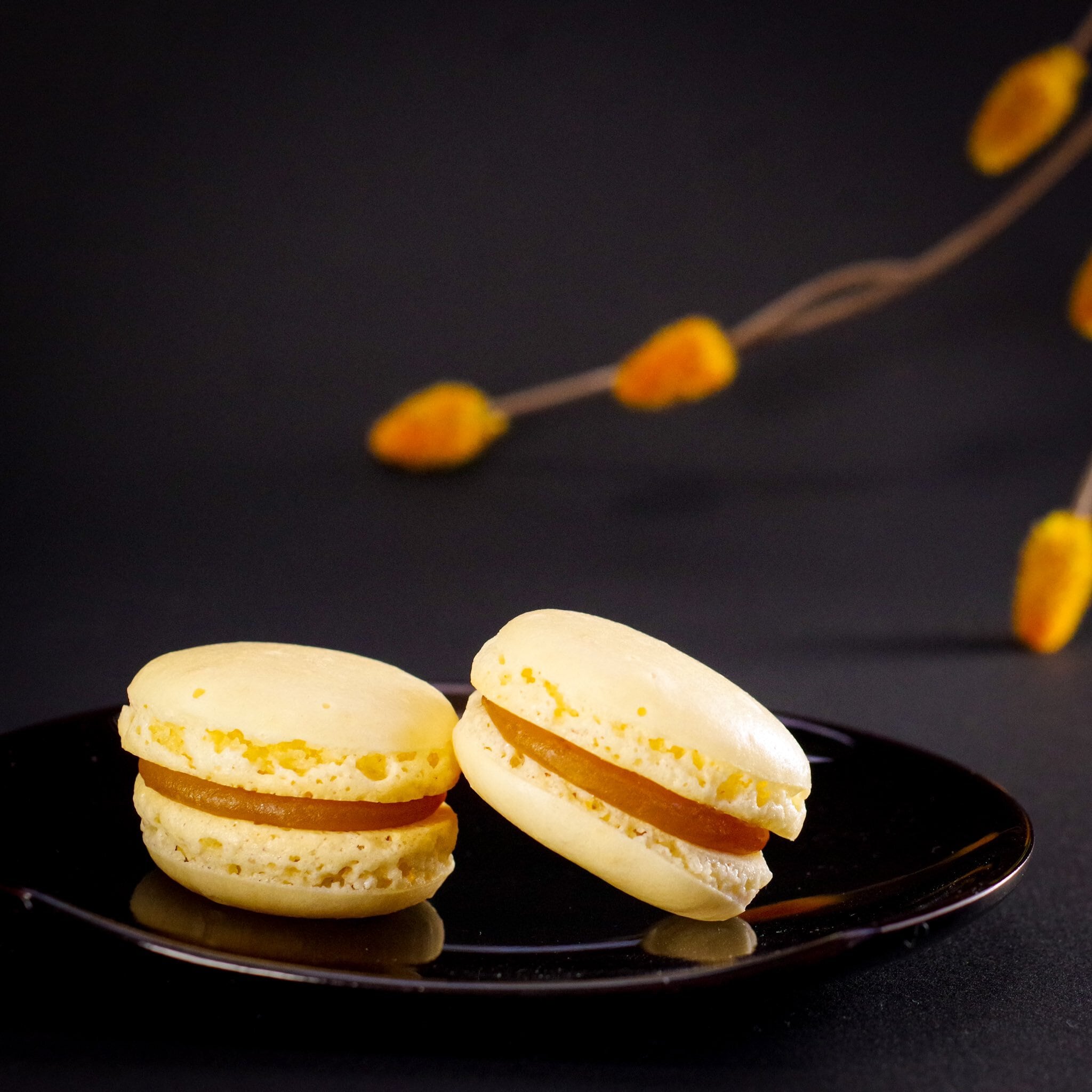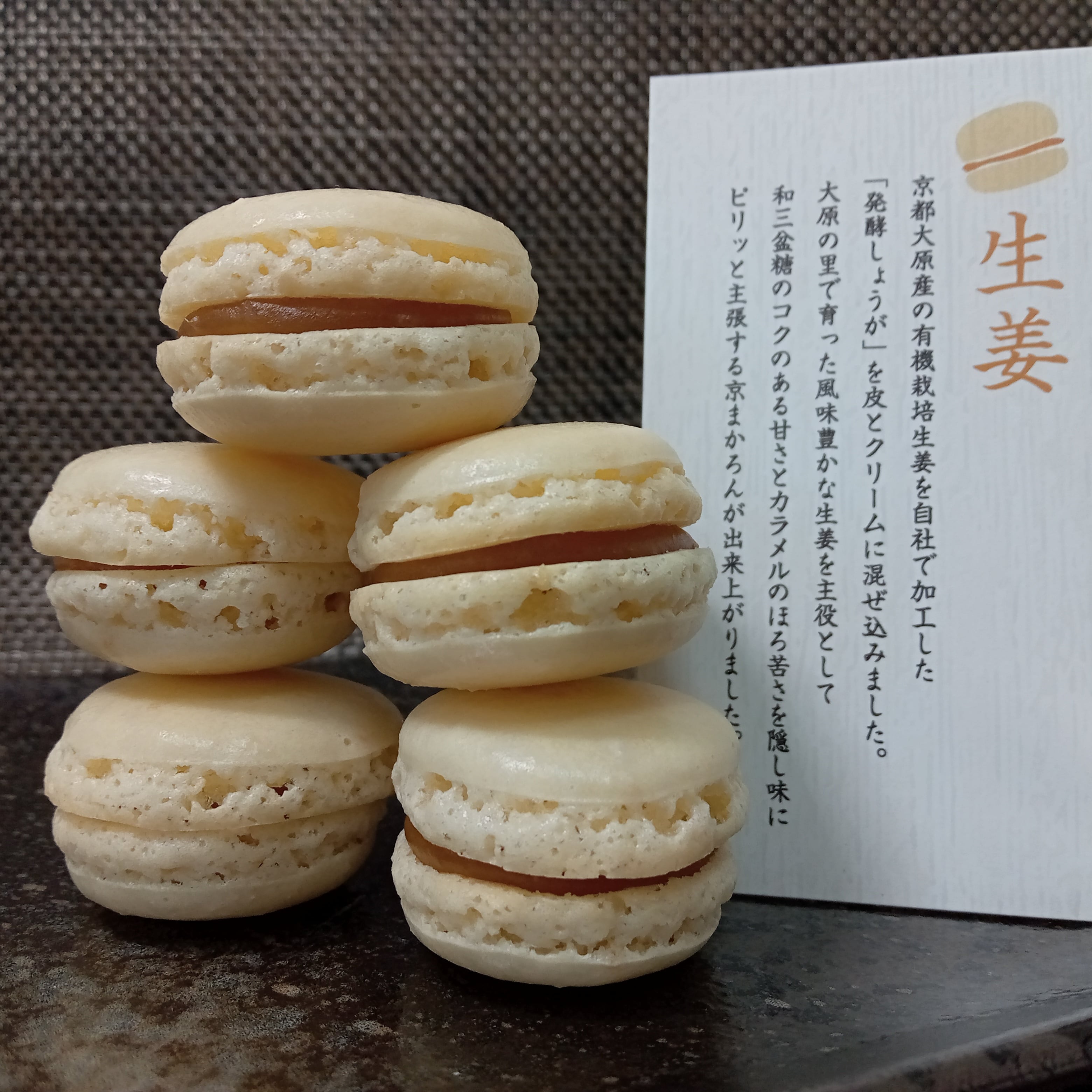 大原の里で育った風味豊かな生姜を主役として和三盆糖のコクのある甘さとカラメルのほろ苦さを隠し味にピリッと主張する京まかろんが出来上がりました。